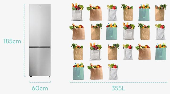 Ez a kombi hűtőszekrény 355 literes, 60 cm széles űrtartalmának köszönhetően akár 18 élelmiszeres táska tárolására is alkalmas. Ráadásul a nagy fagyasztófiókoknak köszönhetően még a legsúlyosabb tárgyak tárolására is több hely áll rendelkezésre.Az összehasonlítás célja, hogy azonnal érthető legyen a termék tényleges űrtartalma, feltételezve, hogy a bevásárlószatyrok telítettségükig meg vannak töltve, és tartalmuk bármilyen helyen tárolható a termék területe. A termék túltöltése nem javasolt, a terméket a használati utasításnak megfelelően kell használni. A zacskók kapacitása az Egyesült Királyság átlagos közepes méretű bevásárlótáska térfogata alapján (forrás: Environment Agency of UK Government, 2011). A hűtőszekrény űrtartalma normál használati beállítással számolva, minden polccal és tartozékkal a helyén.