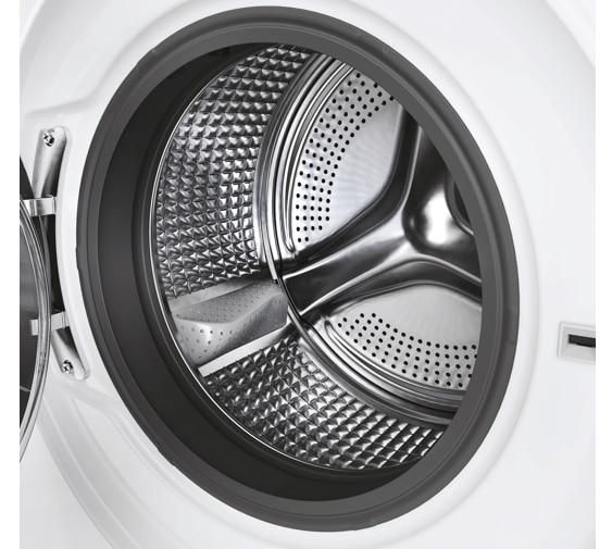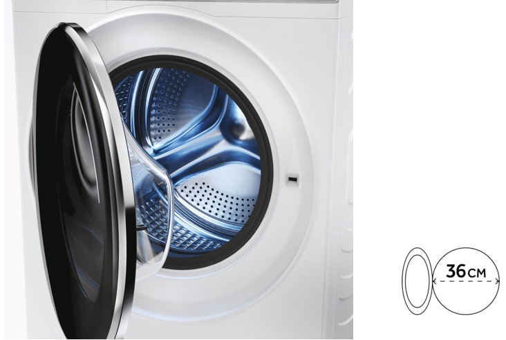 A nagyobb dob (átmérője 52,5 cm a 49,5 cm-hez képest) növeli a mosási teljesítményt és megkönnyíti a vasalási folyamatot (a szennyes kevesebb szifonálással kerül ki). A nagy ablak (36 cm), amelyet kifejezetten úgy terveztek, hogy széles szögben nyitható legyen, megkönnyíti a gép be- és kirakodását, még a terjedelmes szennyes ruhák esetében is.