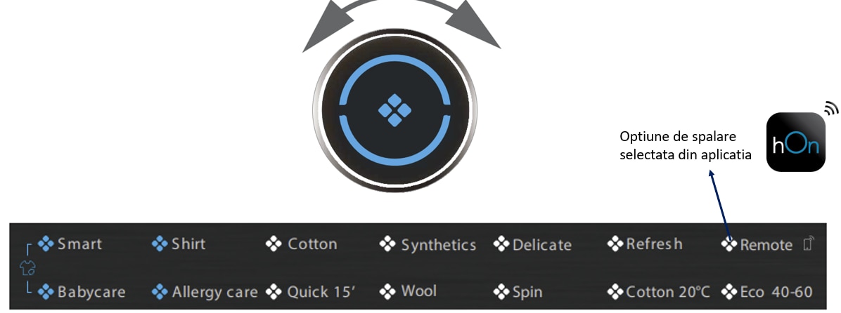 A programválasztót elforgatva állítsa be az anyagok anyagától függően a kívánt mosási opciót. Nem találta meg az Önnek tetsző programot? Állítsa be a „távoli” opciót, és a hOn alkalmazásban biztosan talál egyet.