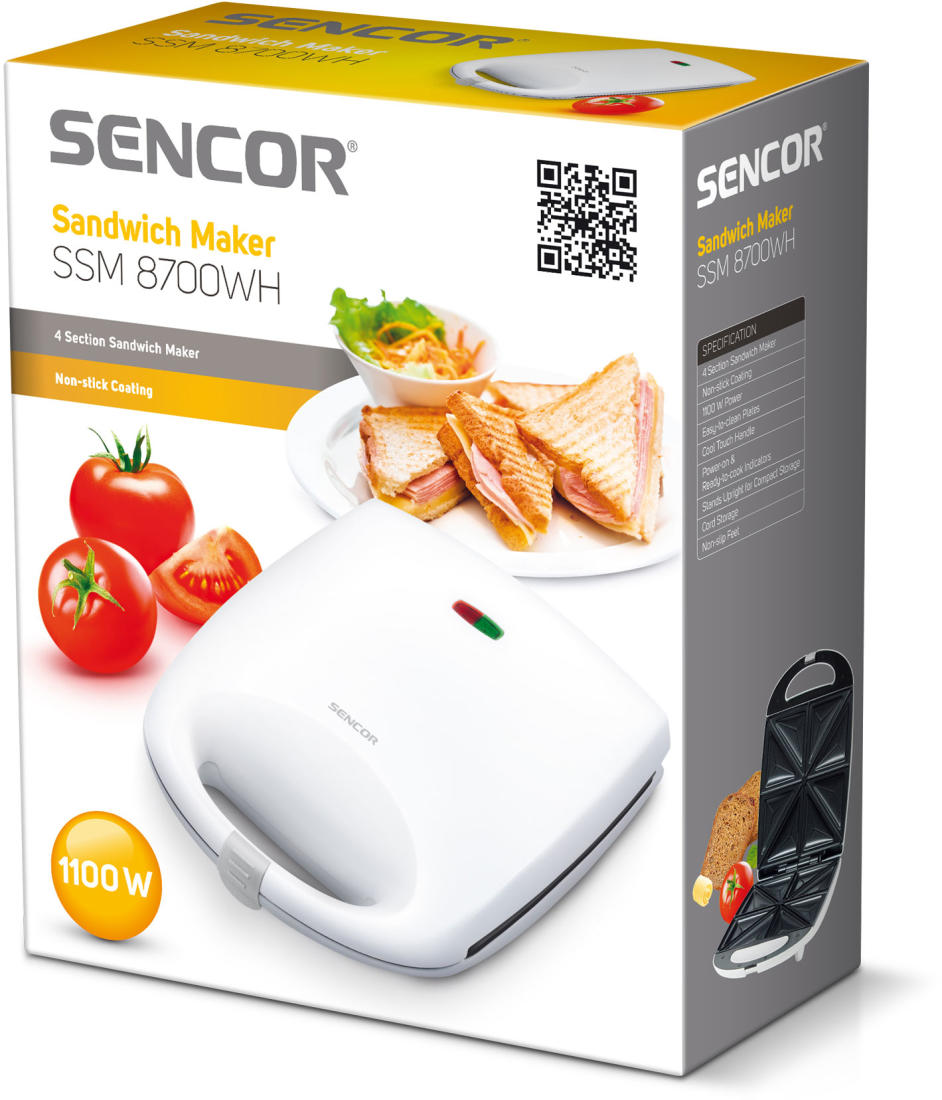 A Sencor SSM 8700WH szendvicssütő ideális választás nagy családok számára, hiszen széles sütőfelületén egyidejűleg 8 darab háromszög alakú szendvics süthető. A tapadásmentes felületnek köszönhetően nem ég le benne az étel és rendkívül egyszerűen tisztítható. A működésjelző fényeknek köszönhetően használata könnyű, így pillanatokon belül készíthetők benne ízletes reggelik vagy uzsonnák. A gyors felmelegedést és a megfelelő sütési hőmérsékletet a készülék 1100 W teljesítménye garantálja.